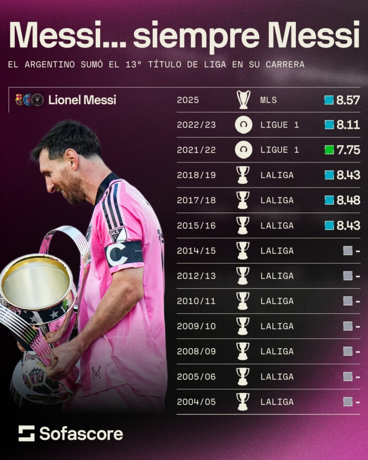 据Sofascore统计,梅西职业生涯至今13次赢得联赛冠军,包括西甲10冠、法甲2冠、美职联1冠。